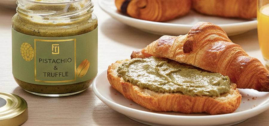 香ばしいピスタチオに黒トリュフの奥行きある香りを重ねた、贅沢なスプレッド。