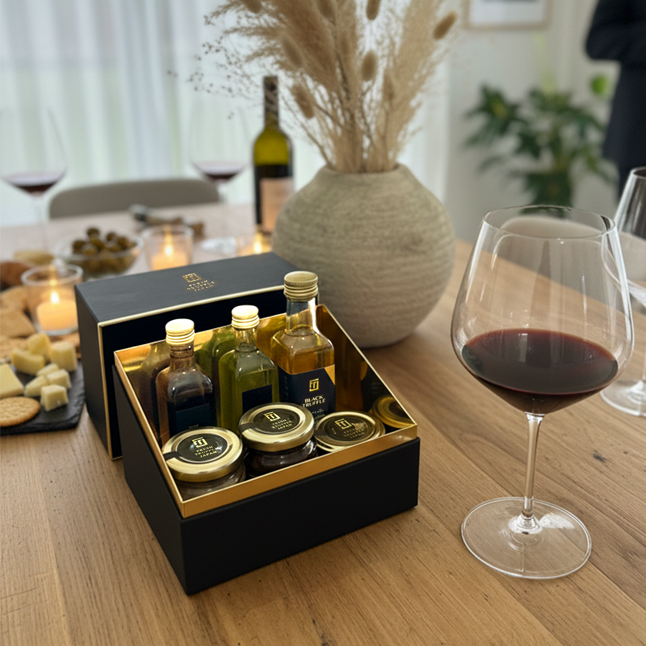 ブラック×ゴールドを基調とした上質なギフトボックスはお気に入りのトリュフグルメを美しく収め、食卓にそのまま並べて楽しむこともできます。