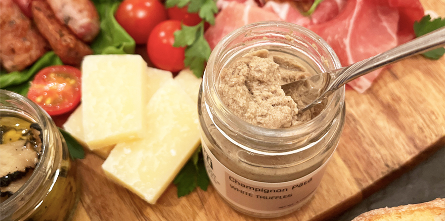 たっぷりのシャンピニオンマッシュルームに、憧れの最高級トリュフである白トリュフ、そして“春の白トリュフ”ビアンケットトリュフを惜しみなく重ねた、イタリアの工房で丁寧に仕上げられた逸品パテ。
