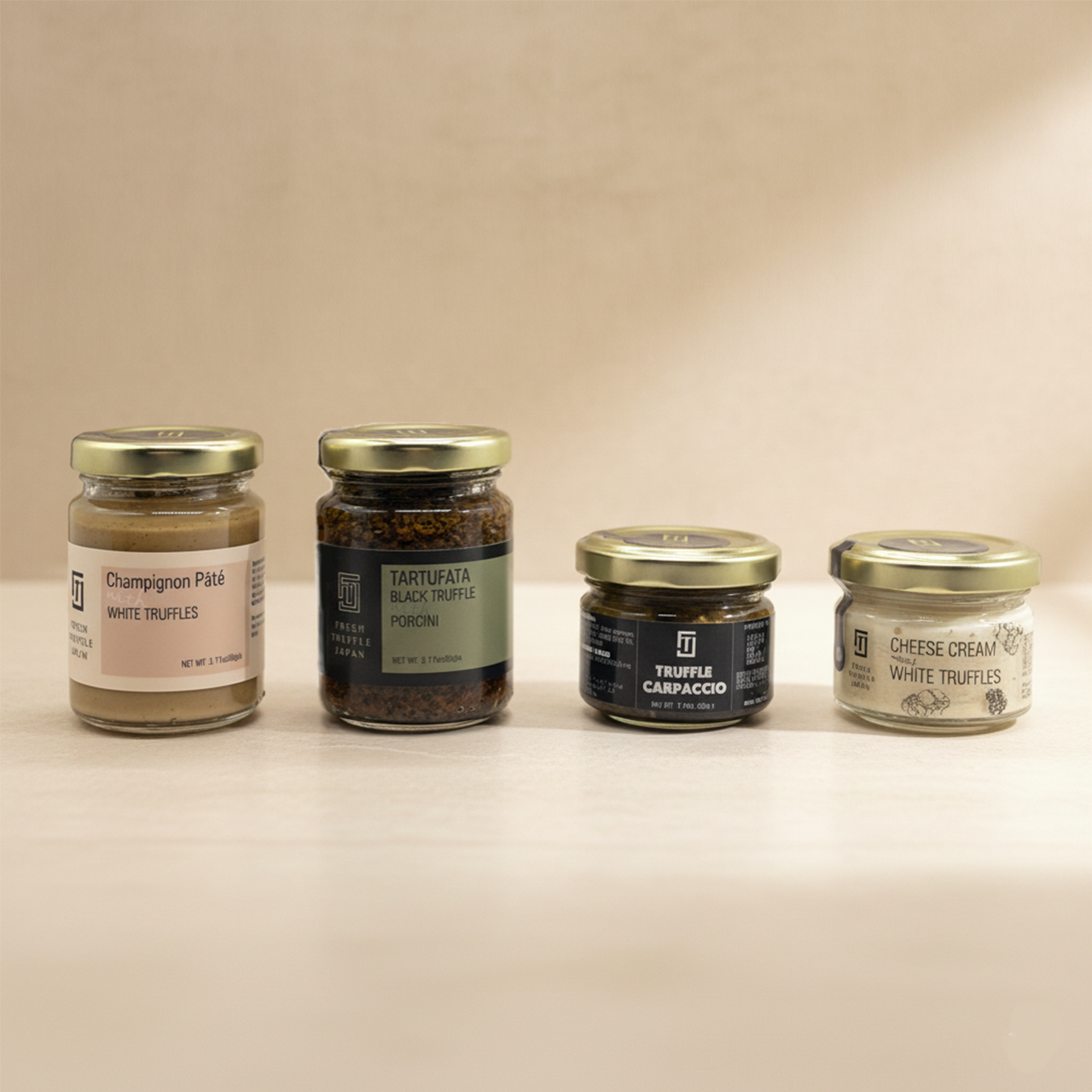 厳選した4種のトリュフグルメ、〈トリュフポルチーニディップ〉〈トリュフチーズクリーム〉〈トリュフパテ〉〈トリュフカルパッチョ〉をひと箱に詰め合わせました。