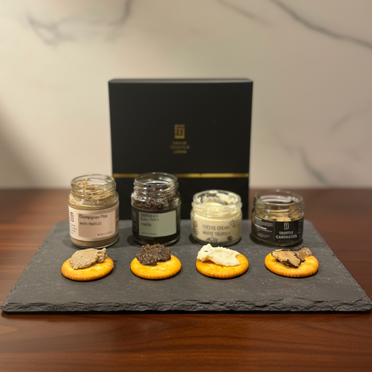 厳選した4種のトリュフグルメ、〈トリュフポルチーニディップ〉〈トリュフチーズクリーム〉〈トリュフパテ〉〈トリュフカルパッチョ〉をひと箱に詰め合わせました。
