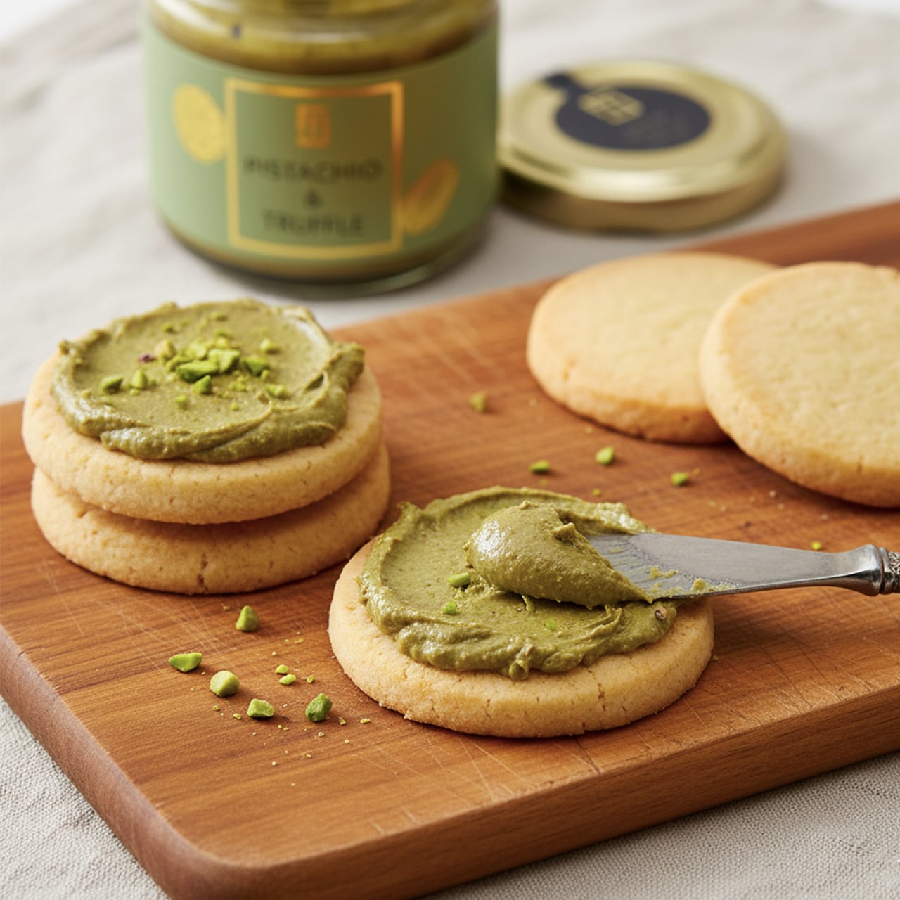 香ばしいピスタチオに黒トリュフの奥行きある香りを重ねた、贅沢なスプレッド。