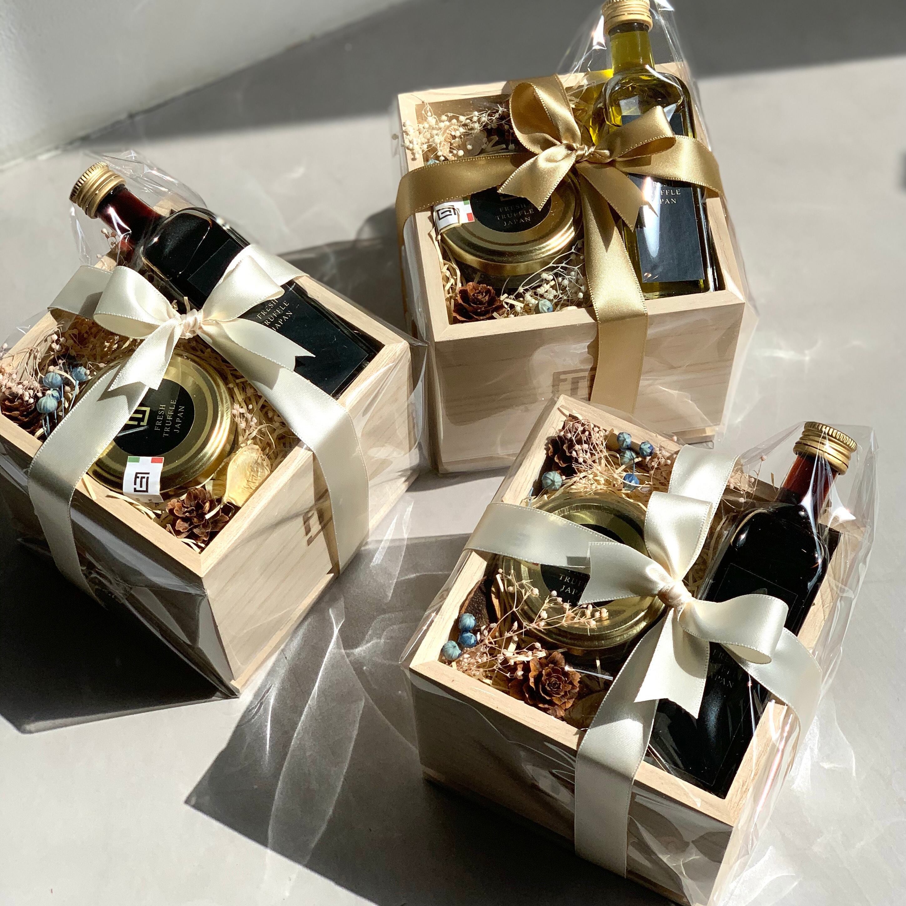 白トリュフ醤油と黒トリュフ塩を素敵な桐箱に詰め合わせた嬉しいギフトセットです。誰しもに身近な調味料である醤油と塩に高級食材トリュフが絶妙にマリアージュされたシーズニングは、トリュフを普段召しあがらない方や和食が好きな方にもご好評いただいております。年齢、性別を問わず幅広く喜ばれるギフトセットです。